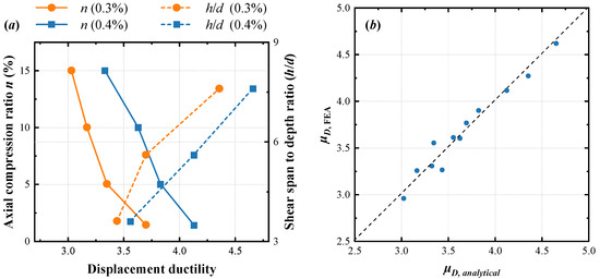 (a) Displacement ductility correlated with shear span to depth ratio and with axial compression ratio ; (b) predicted displacement ductility compared with FEA results.