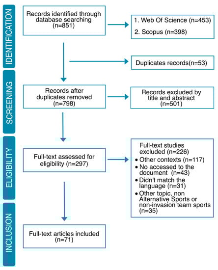Alternative invasion team sports are relatively recent disciplines that are acquiring a greater presence every day. Initially, 851 papers were identified, and 71 articles were selected to meet the inclusion criteria from 2004 to March 2023. A greater number of studies were compiled than in the published reviews [34,35,36], thereby contributing to increasing knowledge about the subject of study and its level of depth, providing a broader view of the scientific production on the subject.