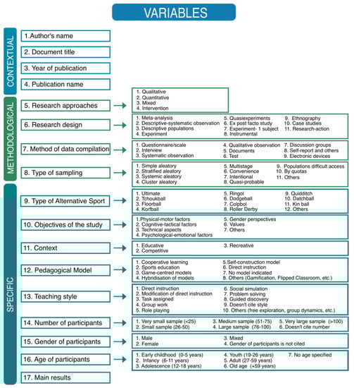 Seventeen variables were defined and grouped into three categories: (i) contextual; (ii) methodological; (iii) alternative sport (AS) specific (Figure 2).