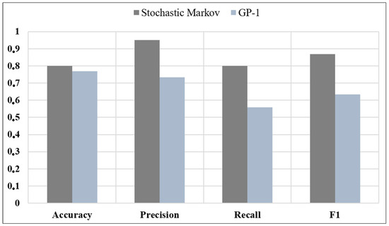 The stochastic Markov model makes use of MCP to quantify the dynamic nature of the refueling of HFV users, specifically within a developing country context. The model provides forecasts and data on refueling times (both weekday and weekend profiles), capacity, and time spent at refueling stations [41,42]. Using this model, it was established that fueling capacity for stations remains steady at 50% capacity between 5:00 a.m. to 8:00 p.m. on weekdays. Average refueling times during peak periods on weekdays were determined to be about 2.7 min, while on the weekends this dropped to 2.5 min. It was also determined that customers spent, on average, 3.8 min at fueling stations during peak periods. The model’s accuracy was verified using real-life hydrogen-fuel vehicle data [24]. The second model focused on predicting refueling behavior, employing a GP-1 model. This model incorporates weather conditions and the time of year to forecast the number of refueling trips [43]. Statistical analysis confirmed the GP-1 model’s significance at a 95% confidence level, accurately converging to predict refueling trips. Through sensitivity tests, it was observed that training the model with 70% of the data resulted in a strong correlation between actual and predicted refueling trips. Factors such as precipitation were considered but were proven to be statistically insignificant. Since the data used in this study did not show an observed pattern when precipitation was considered, precipitation was seen as negligible, as no real variations were noticed in the precipitation data. However, it was noted that in regions where precipitation is significant, this factor would also be prominent, as suggested in [25]. The algorithm was trained using the training data, and its performance was evaluated by comparing it with the actual counts using the test data; the level of accuracy of the predictions is deemed to be high [25]. However, it was noted that this model made use of conventional vehicle data. The Pearson correlation coefficient was calculated to further ascertain the strength and direction of the relationship between the predicted and actual values. This is in line with [44], which indicated that the Pearson correlation is a good way to assess the degree of association between two variables. Hence, the Pearson correlation was calculated, and the Markov model rendered a correlation of 0.974, while the GP-1 model obtained a correlation of 0.846. Furthermore, to gauge the robustness of the algorithms studied and verify the performance of the models, the models were compared with various performance metrics: accuracy, precision, recall, and F1 values [32]. The results obtained are presented in Figure 2 below.