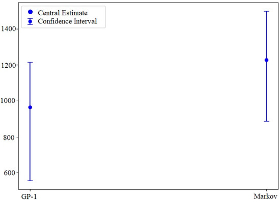 An additional test was also conducted to ascertain whether the difference between the models is statistically significant [48]. The means of the two models, based on their confidence intervals and standard errors, were compared, i.e., a test statistic was calculated and compared with a critical value. For this test, a critical value, Z, of 1.96 for a 95% confidence interval was considered. When the test statistic was compared with the critical value, it was noted that the test statistic falls within the range defined by the critical value, and a p-value of 0.2614 was obtained. It should be noted that the p-value represents the probability of observing a test statistic as extreme as the one calculated, assuming that the null hypothesis is true. Hence, the difference between the two models was not considered statistically significant [48]. The confidence intervals of the two different predictive models were also assessed and plotted. The results are presented in Figure 3.