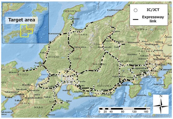 As mentioned above, this study uses CEP data provided by NEXCO Central, which enables the records of expressway usage by foreign tourists to Japan to be determined. CEP data can be used to grasp the IC history of inflows and outflows focused on foreign visitors to Japan who use rental cars on highways in the Chubu region. This data is managed by the NEXCO Central and is not publicly available in Japan. The authors use this data in academic research with the cooperation of NEXCO Central. Figure 1 shows the analysis range in the present study. The targets are expressway ICs and junctions (JCTs) and links between ICs and JCTs in the area located in the central part of the Japanese archipelago.