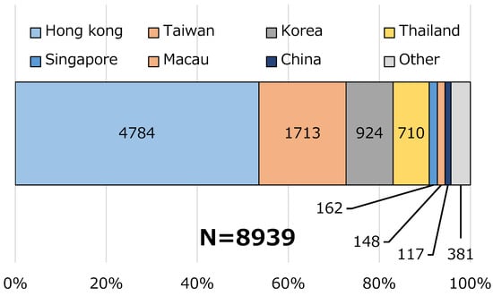 First, the nationalities of the subjects (Figure 2) are determined. Of the 8939 subjects, three countries were the source of the most visitors, which were Hong Kong (53.5%), Taiwan (19.2%), and South Korea (10.3%). It is, therefore, clear that most visitors to Japan using rental cars are from Asia. In addition, classified under “Other”, there were visitors from the United States, the United Kingdom, Australia, Canada, and Malaysia, although the numbers were small. These statistics were generally consistent with a previous study [15].