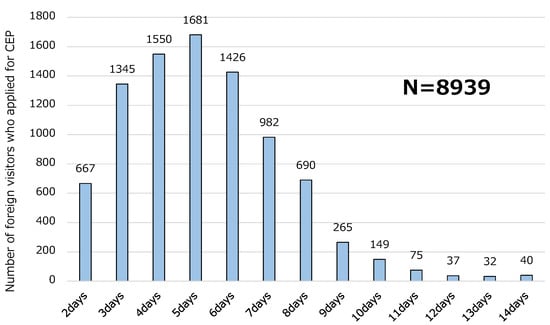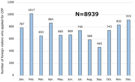 Next, Figure 3 shows the tabulated results for each unlimited expressway ride period (2–14 days) that is registered when applying for the CEP. The most popular choice among the visitors was for the five-day unlimited ride period (18.8%), and almost 75% of tourists prefer no more than a six-day unlimited ride period. Figure 3 shows that there were a small number of people who applied for unlimited rides for periods of 10 days or more (approximately 3.7%). Figure 4 shows the aggregated results of CEP application status by calendar month. It shows a relatively level trend for each month, with February being the most (11.4%), and September the least popular (5.2%). The CEP data with these data structures were used to calculate the actual number of users of expressways.