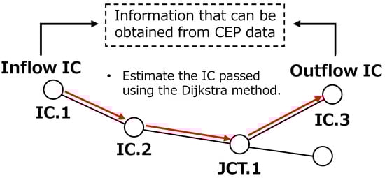 Figure 5 shows the method of calculating records of usage for each link between ICs in this analysis. First, as shown in Table 1, the CEP data includes the inflow and outflow IC names, but it is not possible to determine the ICs through which the tourists have passed. The purpose of this analysis is to calculate the record of usage for each IC. Therefore, we estimated the “passed” IC from the inflow and outflow ICs by searching for the shortest path using Dijkstra’s algorithm [21]. Dijkstra’s method was applied to the inflow and outflow IC information of each user (72,837 data records) that could be determined from the CEP data to calculate the passing ICs. In subsequent analysis in the present study, the 498 links in the IC sections, which are within the range where the CEP is applied, were analyzed.