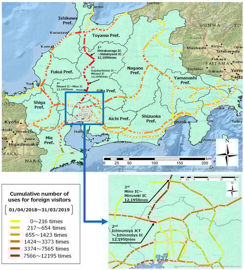 The method described in the previous section was used to calculate and visualize the records of expressway usage of foreign tourists to Japan for each link (Figure 6). Darker link colors indicate a higher record of usage. Figure 6 shows the record of usage of each IC within the jurisdiction of NEXCO Central (CEP range), and expands the areas with high expressway network density in Aichi Prefecture. It can be seen from Figure 6 that foreign tourists to Japan who applied for the CEP from 1 April 2018 to 31 March 2019 tended to use it mainly in Aichi Prefecture. In addition, the tourist route called Shoryudo, which connects Aichi, Gifu, Toyama, and Ishikawa Prefectures to the north and south, has a particularly high record of usage. Table 3 shows the top five ICs that have the highest numbers of records of usage within the target range. The results show that the usage volume is highest from the Shirakawago IC to the Hida Kiyomi IC (12,195 times during the period from 1 April 2018 to 31 March 2019). The next point is Ichinomiya JCT–Ichinomiya IC and Mino IC–Mino Seki JCT, which have many records of usage. These are the ICs near the center of Aichi Prefecture, and they are routes that lead to the Shoryudo. Therefore, measuring the number of tourists who flow in or out of Shoryudo reveals an increase in the records of usage. Furthermore, there are high records of usage for Minami IC–Mino IC, and Gujo Hachiman IC–Minami IC, which are both within the sightseeing route of Shoryudo.