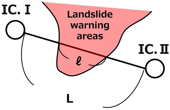 Next, the landslide disaster risk index for each link in the IC section is calculated. The data used were the landslide warning area data obtained from the National Land Information Division download site that is managed by the Ministry of Land, Infrastructure, Transport and Tourism [23]. Landslide warning areas are defined by experts based on three-dimensional mapping from aerial photographs and on-site surveys and are a group of data compiled by local governments on places where landslide disasters can occur due to landslides and debris flows on steep slopes. Areas where landslide disasters can occur can be determined in a planar manner (as polygon data). In this analysis, the index for each link is determined by the method shown in Figure 8. The distance between IC.I and IC.II is set to ; the locations between the links of IC.I and IC.II that overlap with landslide warning area data are set as ; and the following Equation is used as an index of the risk for landslide disasters: