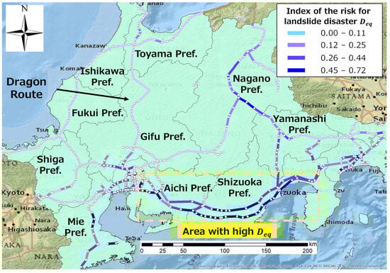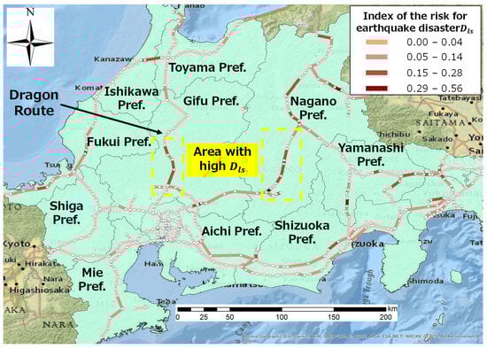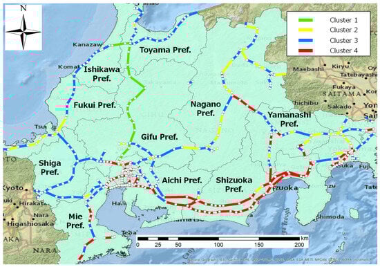 Figure 13 shows a visualization of these cluster classifications. The Shoryudo, which has an extremely large number of records of usage by foreign tourists to Japan, belongs to cluster 1. Furthermore, the group of links with a relatively high risk of landslide disaster (cluster 2) tended to be more in the Nagano and western Fukui Prefectures. In addition, the group of links with an extremely high risk of earthquake disaster (cluster 3) is concentrated in Aichi and Shizuoka Prefectures, as well as in Mie Prefecture. Based on the above, we conducted a cluster analysis using the record of usage, , and for each IC section link calculated in this analysis, which enabled us to group the disaster risk and potential of exposure to foreign tourists to Japan for each link.