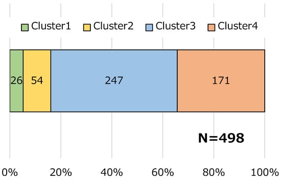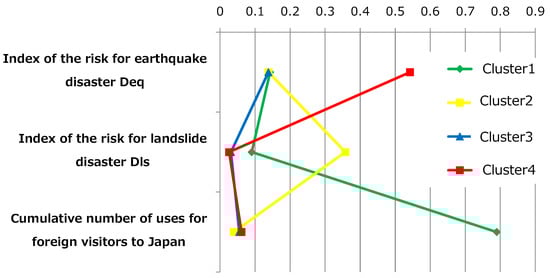 The method used was a non-hierarchical cluster analysis that can group the similarities of the three variables. Figure 11 and Figure 12 show the results of the four-way classification for the above three variables using the k-means method, which is widely used in non-hierarchical cluster analysis. The features of each cluster can be determined from Figure 12. For example, in cluster 1, the central value of the cluster shows low values for the risk index for earthquake disasters and risk index for landslide disasters, and the value for the record of expressway usage is high. Therefore, the expressways belonging to cluster 1 can be interpreted as a “group of links with a high possibility of being used by many foreign tourists to Japan and a relatively low risk of earthquake and landslide disasters”. Table 4 shows the results of interpreting the characteristics of each cluster. In cluster 2, is low, but is at a moderate level of risk. The record of usage by foreign tourists to Japan is low, but it can be seen that there is a risk of landslide disasters. It can also be seen that cluster 3 is a group of links with both a low record of usage and a risk of disasters. Finally, cluster 4 is confirmed as a group of links with an extremely high risk of earthquake disasters, although its record of usage is small.