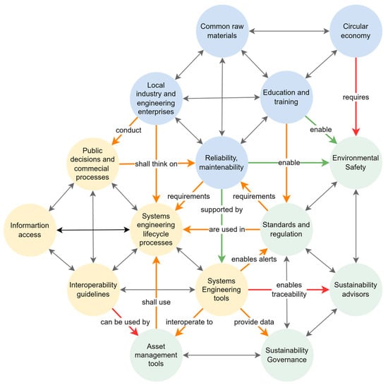 In Figure 1, concepts are colored circles according to disciplines (green for sustainability, blue for modern engineering, and yellow for systems engineering), and relationships are colored arrows (to be explained later in Section 2.4 and Section 2.7).