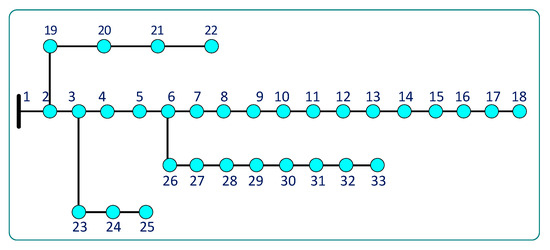 In [24], a bacterial foraging optimization algorithm is employed to minimize the total power loss and enhance the voltage characteristics of radial distribution systems with distributed generation. The proposed method is intended to enhance the efficacy of the bacterial foraging optimization algorithm. Distributed generators and battery energy storage are utilized concurrently to enhance the reliability of distribution networks in [25]. In order to address the optimization problem, a multi-objective evolutionary algorithm is utilized to enhance the network’s dependability and reduce drop in voltage. A method for the best location of distributed green power and capacitor banks determined by technical and economic parameters is devised in [26]. In [27], the optimal DG scheduling problem is allocated in a distribution network. The analysis of the DG planned problem is specifically depicted as a financial cost-benefit analysis due to reduced power purchased and reduced penalty emission cost resulting from decreased emission in the network. In [28], an optimal structure for a hybrid photovoltaic–wind system design combined with battery storage appears, taking based on the cloud uncertainty modeling and battery degradation into account, and minimizing the total net present cost, load loss, and battery degradation cost. In [29], the economic modeling of a sustainable island system consisting of a wind turbine, battery, combined heat and power system, and thermal storage to simultaneously meet electrical and thermal demands is carried out. The method seeks to discover the lowest possible capital, repair and maintenance, and operating costs, as well as the least amount of pollution associated with these factors. In [30], teaching and learning algorithms are applied to allocate the distributed generation in distribution networks. The particle swarm optimization technique is used in [31] to place wind turbines and photovoltaic cells in the distribution network with the goal of lowering losses and enhancing voltage stability.