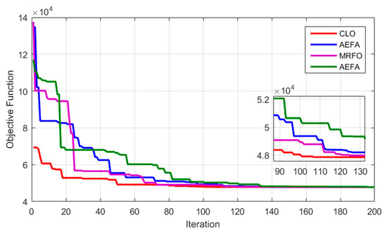 - To verify the performance of the CLO algorithm in solving the problem, its performance has been compared with the methods of particle swarm optimization (PSO) [39], fish table foraging (MRFO) [40], and artificial electric field algorithm (AEFA) [41].