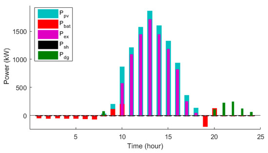 where the cost and value of load shedding in day d at hour t are represented by and , respectively. Here, for the constructed microgrid, , where , , , and are the output power generation of PV system, diesel generator, battery system, as well as load demand in the hybrid system, respectively.