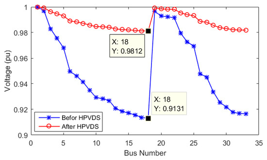 Voltage fluctuations of the 33-bus network before and after using the hybrid system.
