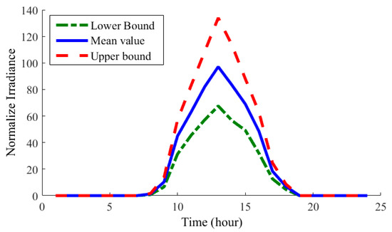 There is often uncertainty regarding both the amount of load demand and the amount of solar radiation in an area. It is common to forecast photovoltaic radiation and network load using beta and normal probability distribution functions (PDFs). In this paper, Monte Carlo is used to generate a set of sample scenarios of load demand and solar radiation based on these PDFs. For this purpose, 1000 random data points have been created for each amount. Throughout this analysis, it is assumed that the quantity of radiation or load each hour will fall within two limits. The upper and lower limits are determined by the distribution network load, the microgrid load, and the amount of sunshine during the day. The restrictions are shown in Figure 11, Figure 12 and Figure 13.
