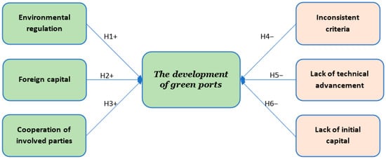 To safeguard the port environment and lower the danger of pollution, environmental regulations comprise both international conventions and national policies [8,29,30,31,32,33,34]. The International Maritime Organization (IMO) was founded by the United Nations in 1948 to develop and enforce a comprehensive regulatory framework for shipping. It is now in charge of issues with security at sea, the environment, legislation, technological collaboration, shipping efficiency, and more. The majority of states, including Vietnam, have ratified the IMO conventions. At the same time, the European Union has established a number of environmental rules that primarily focus on air pollution, wildlife and biodiversity, water and marine ecosystems, soil, waste, and other aspects that would reduce environmental threats. The European directives must be followed by all EU members. Each country must ratify the European regulation and implement it into its legal system within a reasonable time limit. According to its needs and obligations, each nation builds its environmental policy. The nation’s environmental policy combines its obligations and goals [35]. For instance, by the year 2030, the Vietnamese government wants all ports to operate in accordance with green port standards. We predict that environmental restrictions will have a significant influence on the development of green port policies based on the justification given above [8,31,33,34,36].