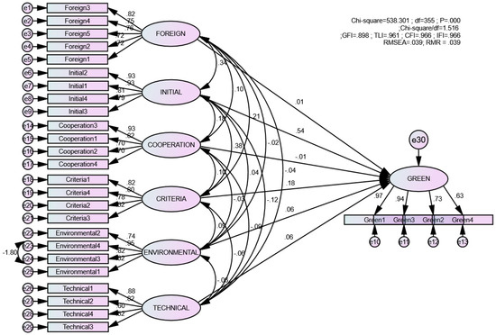 As shown in Table 4, all of the CR values for environmental regulation (0.84), foreign capital (0.86), cooperation of involved parties (0.92), inconsistent criteria (0.85), lack of technical advancement (0.83), lack of initial capital (0.89), and the development of a green port (0.89), respectively, were greater than the threshold value of 0.7. Additionally, all of the items’ Cronbach’s alpha values—0.83, 0.87, 0.91, 0.86, 0.83, 0.89, 0.89—exceeded the threshold value of 0.7 for each of the following: environmental regulation, foreign capital, cooperation of involved parties, inconsistent criteria, lack of technical advancement, lack of initial capital, and the development of a green port (Table 4).
