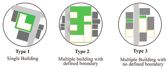 The first step of evaluation is to categorize the campus based on its physical area, visible boundary, and infrastructure. Through a physical site survey, observation, and digital mapping, the desired result can be revealed in the form of three categories: (1) single buildings with no defined boundary; (2) multiple buildings with defined boundaries; and (3) multiple buildings with no defined boundary (Figure 3). The basic facilities and functions of an HEI can also be identified through this evaluation process.