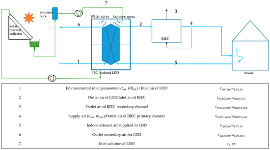 Figure 1 depicts the proposed schematic diagram for the , which consists of internally cooled LDD assisted by solar energy regeneration and RIEC. The system is designed to address the heat and humidity load by dehumidifying the fresh air first in the LDD unit, followed by cooling the air with RIEC before circulating it throughout the room. To ensure the efficient operation of the LDD, the working air for internal cooling is drawn from the indoor exhaust air. The liquid desiccant cooling system has three loops, including the solar regenerator solution and dehumidifier loop, the internal evaporative cooling water loop, and the fresh air loop.