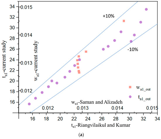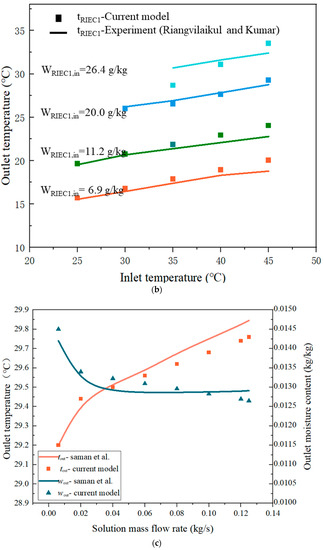 The accuracy of the numerical models developed for the main components of ( and ) have been validated by two published research papers (Figure 3). The simulation results of the internally cooled are compared to a study that used the as its internal cooling method. To explore the exit moisture content of primary air produced by an internally cooled LDD process at various mass flow rates, the numerical model created by Saman and Alizadeh [24] was compared with the new model. The output moisture content parameters of the two models were compared under identical primary and secondary air intake conditions and operating circumstances (primary air: 33 °C, 0.171 kg/kg; secondary air 27 °C, 0.100 kg/kg, = 0.42 kg/s, = 1 m/s, = 1). The results of the newly constructed model varied from those in the literature by 1.5 to 6.3%. Riangvilaikul and Kumar [25] conducted experiments using partially treated primary air directly as the secondary air source in the model. The outlet temperature is examined in this experiment. The previous model was applied to the current study, simulating it with the same inlet condition and flow pattern. The outlet temperature differential ranged from 0.9% to 10.0% based on the statistical analysis.