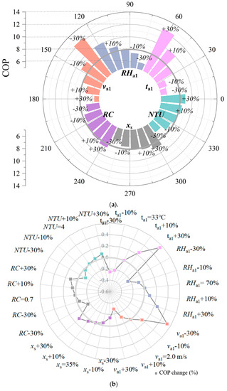 Figure 4a,b illustrates the impact of parameter variations on based on the baseline scenario. The inlet temperature has the greatest influence on the system ; it is determined by the outdoor environmental conditions. However, without changing the operating parameters, it is not possible to improve the system under constant outdoor conditions. The factor and have a significant impact on the system . determines the ratio of the secondary airflow in and , allocating the cooling and dehumidification capacity of the system. It can significantly affect the system’s and has greater potential for system optimization.