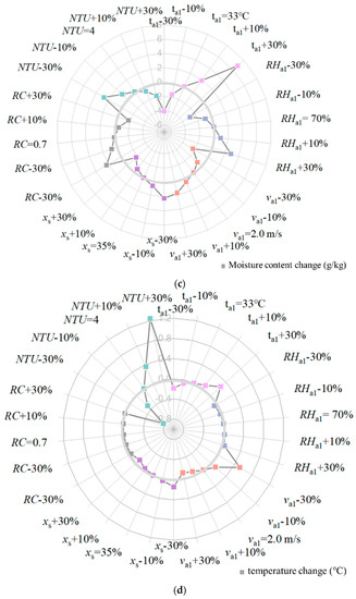 Influence of 6 sensitive factors. (a) of system under different parameters. (b) Influence of parameter variations on based on the baseline scenario. (c) Influence of parameter variations on outlet air moisture content change of the system based on the baseline scenario. (d) Influence of parameter variations on the change in outlet air temperature change based on the baseline scenario.