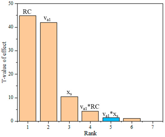 Pareto chart of the operating parameters and cross-influence factors. (: secondary to primary air mass flow ratio in LDD; : inlet air velocity; : concentration of the solution; :cross effect of the and ; : cross effect of the and ).