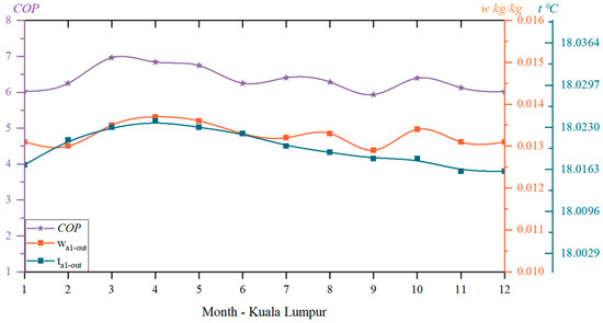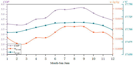 This section demonstrates the application of regression models for performance prediction in various hot and humid urban areas, alongside the implementation of optimized control strategies tailored to local meteorological conditions. Using derived regression models (Equations (20)–(22)), the operating parameters were optimized with outlet temperature and humidity content, as well as system as the optimization objectives (Table 3). The regional adaptability of the system was illustrated by operating it in three selected cities under the optimized parameters, as shown in Figure 8, Figure 9 and Figure 10. The effectively reduced the outlet temperature and humidity during the high-temperature seasons in these regions, achieving performance coefficients () ranging from 3.93 to 6.29, which is up to 57.25% increase compared to the system with a of 4.