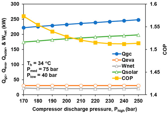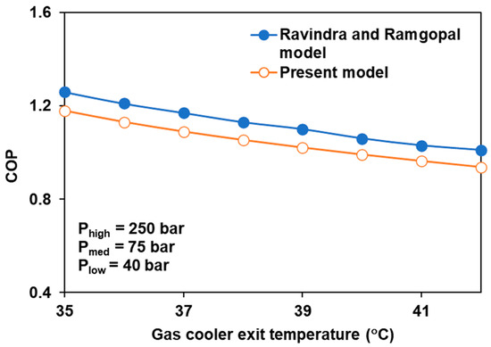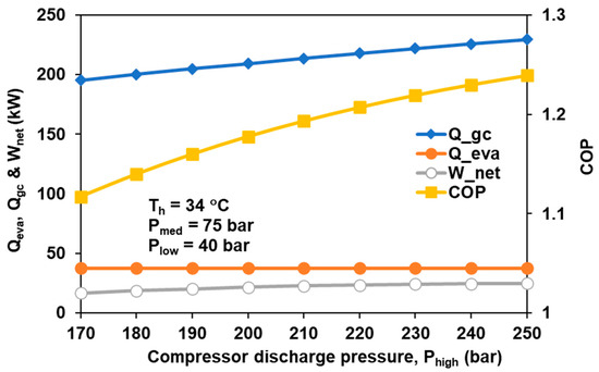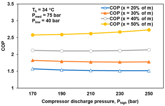 - With an increase in bleed mass (maximum 0.5 kg/s), the overall COP of the system marks the highest value (about 2.73 at 250 bar system maximum pressure and 34 °C gas cooler exit temperature).