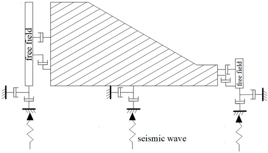 Seismic loads are applied to the model as sinusoidal waves using velocity inputs from the bottom of the model, and the velocity time course is converted into a stress time course using Formulas (1) and (2). Finally, the stress time course curve is input into the model through the viscous boundary. The duration of the applied seismic wave is 0.2 s. When the model’s run time is greater than the duration of the seismic wave, the value of the seismic wave is zero; when the model’s run time is less than the duration of the seismic wave, the value of the seismic wave is calculated using Formula (3).