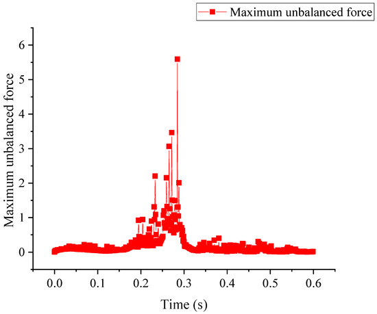 The displacement of the slope reaches equilibrium within 0.2 s since the model has been divided into more blocks. Taking into account the long actual time of the model’s computation, the loading duration of the seismic wave is 0.2 s, and the running time of the model is set to 0.6 s. By monitoring the maximum unbalanced force of the model, it can be found in Figure 4 that when the running time is 0.6 s, the maximum unbalanced force tends to be 0. It can be assumed that the model is already in equilibrium at this time, so the displacement of the slope model has also reached equilibrium.