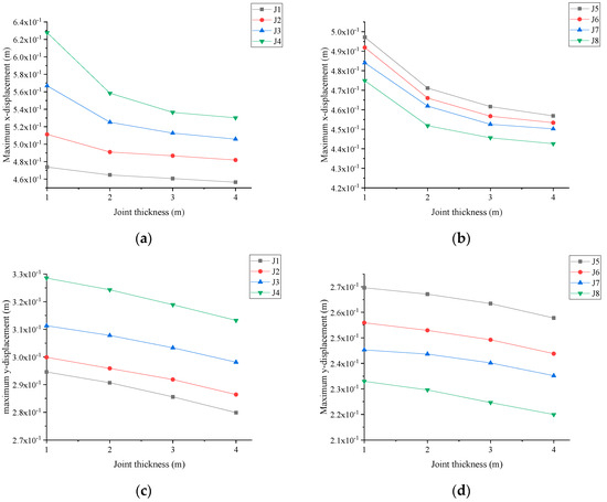 Influence of joint thickness on slope displacement response: (a) maximum x−displacement of the slope surface monitoring points; (b) maximum x−displacement of the inside slope monitoring points; (c) maximum y−displacement of the slope surface monitoring points; (d) and maximum y−displacement of the inside slope monitoring points.