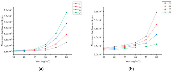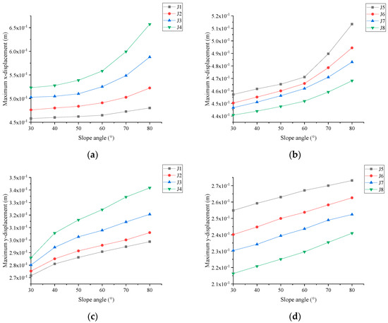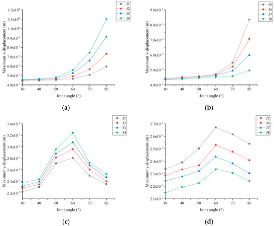 As can be observed from Figure 6a,b, the maximum displacement in the x direction is less affected by a change in joint inclination angle when it is less than 50°. The maximum displacement in the x direction clearly increases with an increasing joint inclination angle at joint inclination angles of 60°, 70°, and 80°. In Figure 6c,d, it can be seen that the maximum displacement in the y direction exhibits an increasing and, subsequently, declining pattern as the joint inclination angle increases, and it achieves its maximum when the joint inclination angle is 60°. Cheng et al. [1] found that the x direction displacement is maximum between the joint inclination angles of 60° and 70°; this is due to the characterization of the bending moment effect, where the joint inclination angle between 60° and 70° is the dominant interval for the occurrence of tipping. We determined that the maximum displacement in the y direction was greatest at a joint inclination angle of 60°, which is probably due to bending moment effects; confirmation of the cause requires further research.