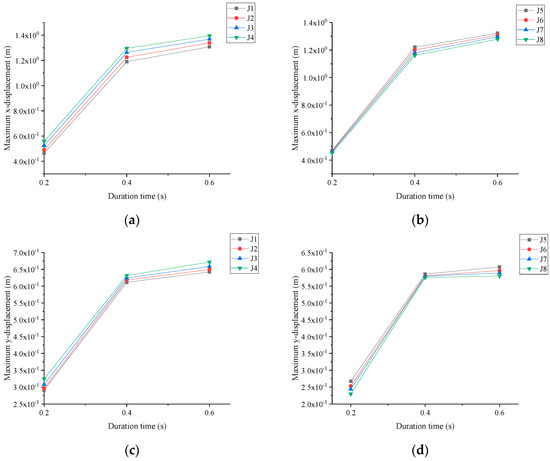 Influence of seismic wave duration on slope displacement response: (a) maximum x−displacement of the slope surface monitoring points; (b) maximum x−displacement of the inside slope monitoring points; (c) maximum y−displacement of the slope surface monitoring points; (d) maximum y−displacement of the inside slope monitoring points.