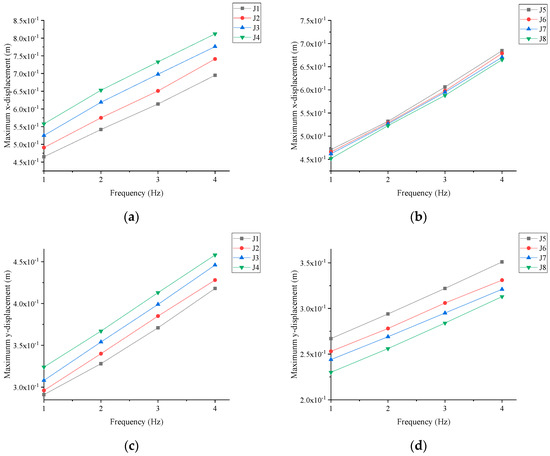 Influence of seismic wave frequency on slope displacement response: (a) maximum x−displacement of the slope surface monitoring points; (b) maximum x−displacement of the inside slope monitoring points; (c) maximum y−displacement of the slope surface monitoring points; (d) maximum y−displacement of the inside slope monitoring points.
