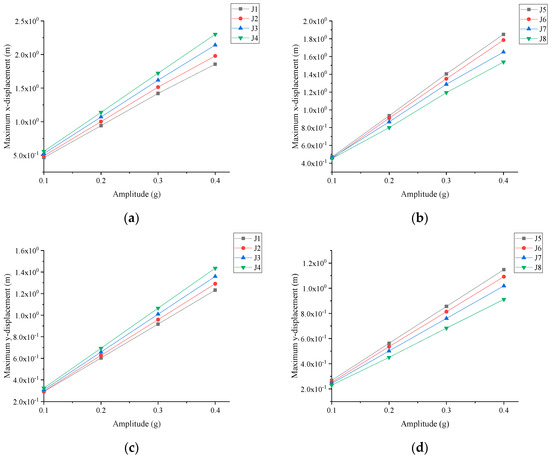 Influence of seismic wave amplitude on slope displacement response: (a) maximum x−displacement of the slope surface monitoring points; (b) maximum x−displacement of the inside slope monitoring points; (c) maximum y−displacement of the slope surface monitoring points; (d) maximum y−displacement of the inside slope monitoring points.
