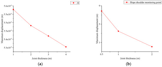 Influence of joint thickness on slope displacement response: (a) maximum displacement at monitoring point J4; (b) maximum displacement of slope shoulder monitoring point [17].