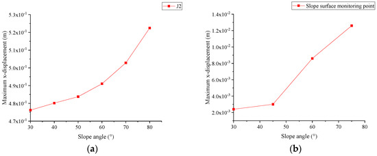 The effect of slope angle on the maximum displacement in the x direction was analyzed using the monitoring points in the middle and lower parts of the slope surface as research objects. Figure 13a shows that when the slope angle is less than 50°, the change in the slope angle has less of an influence on the maximum displacement in the x direction of the monitoring point, and when the slope angle is more than 50°, the maximum displacement in the x direction is more influenced by the slope angle. The pattern of change in maximum displacement with slope angle in the x direction at monitoring point J2 in this paper is similar to that reported by Cheng et al. [1]. The findings of this study demonstrate that when the slope angle increases, the maximum rate of change in displacement at monitoring point J2 increases. When the slope angles range from 70° to 80°, the maximum rate of change in displacement is higher than at other slope angle ranges, while Cheng et al.’s [1] findings indicated that the greatest displacement in the x direction changes at the fastest rate for slope angles between 45° and 60°. When analyzing the reasons, it can be seen that the larger the slope angle, the steeper the slope, and the better the air conditions of the slope. Additionally, the required shear damage for the slope also reduces. As a result, the maximum slope displacement changes at a faster rate as the slope angle rises.