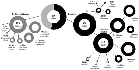 Internal displacements in 2022: breakdown by conflict, violence and disasters. Source: authors’ own elaboration based on the Global Report on Internal Displacement 2023 [17].