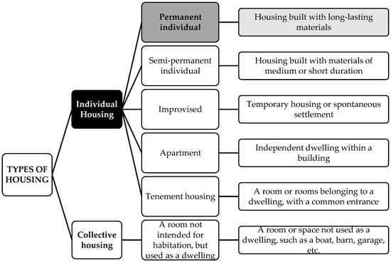 Panamanian housing as an example of housing typology that is used worldwide. Source: authors’ own elaboration based on the document of definitions and considerations of the Population and Housing Census of the Republic of Panama [23].