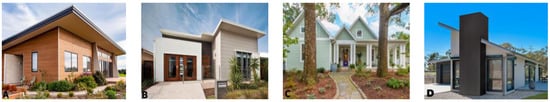 Sustainable housing models: (A) Harmony House [79]; (B) Caloundra [80]; (C) The Owen Residence [81]; (D) Sapphire Passive House [82].
