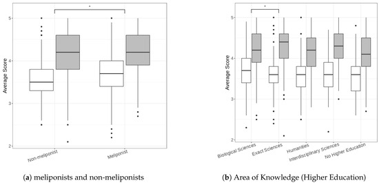 - Self-efficacy: Self-efficacy is an essential component of environmental citizenship, which depends on an individual’s beliefs about their capabilities to learn specific content, knowledge, and sufficient skills to bring positive change to their communities or themselves. Self-efficacy is sometimes referred to as “perceived competence” or “perceived behavioral control” [31]. We evaluated the participants’ perception of self-efficacy related to skills in bee biology, bee monitoring, meliponiculture, and science. To detect subtle changes in this dimension and increase the accuracy of our conclusions, we considered a 10-point Likert scale (where 1 is ‘not capable at all’ and 10 is ‘very much capable’).