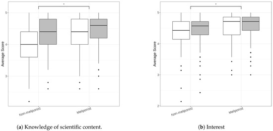 - Interest: Phillips et al. [30] defined interest as the degree to which an individual assigns personal relevance to a scientific or environmental topic or endeavor. It can also be considered a key precursor to deeper engagement in participatory decision-making processes in science [32]. We assessed the participants’ interests regarding bees, sustainability, science, and social interactions. We considered a 5-point Likert scale (where 1 is ‘strongly disagree’ and 5 is ’strongly agree’).