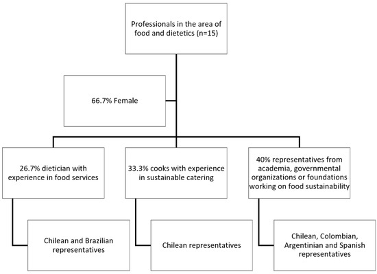 As part of the methodology, the sampling was non-probabilistic for convenience based on the selection criteria of the study, which considered professionals with experience of at least 5 years, in the area of food and/or a sustainable diet, in addition to signing the informed consent, an instrument validated by the Ethics Committee for Research in Human Beings of the Faculty of Medicine of the University of Chile (105-2021), which guarantees the handling and support of the data obtained, as well as the confidentiality of the latter. The sample was obtained by theoretical saturation; that is, when new additional data is not found to develop properties of the category by replicating similar instances of categories repeatedly, it becomes empirically sure that a category is saturated [19]. In this investigation, the saturation was completed with 15 experts from Chile, Colombia, Brazil, Argentina, and Spain (Figure 1).