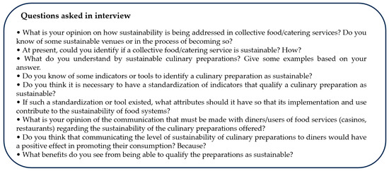 With respect to the standardization of sustainability indicators, the participants completely concurred with the notion that there needs to exist a tool that recognizes collective food or catering services as sustainable; this identified a gap between understanding and methodology in relation to the instrument of information collection. This opinion was maintained regardless of the nationalities of the participants.