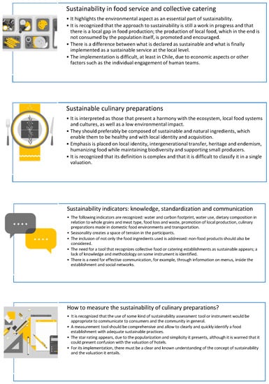 One of the options that garnered a positive view and opinion from the participants of the study was a rating that utilizes stars because of its popularity and the simplicity presented by this evaluation methodology, but some showed opposition to the style of this tool and its adaptability along with the possible confusion with hotel ratings. It was also mentioned that they should be easily understood by consumers, using ecological shapes or forms related to nature, mainly from the viewpoint of the chefs, such as leaves or plants or even the adaptation of the symbols to represent diverse locations. In any case, there must exist a clear understanding and recognition of the concept of sustainability and its value that leads to sociosanitary care and the protection of ecosystems. Figure 3 shows the main results obtained from the interviews conducted with the participants.