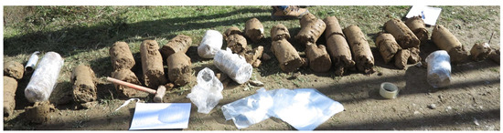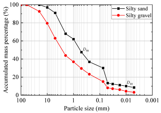 The experimental site is located in the gently sloping plateau region of Aba Prefecture, Sichuan Province, China, at an elevation exceeding 2000 m. The area features a widespread and moderately thick deposit of gravelly silty soil, with some tower foundations directly situated onto this soil layer. Based on the field exploration results (Figure 1), the geological strata within the scope of the site investigation exhibit relative simplicity, primarily comprising two layers. These layers are identified as the Quaternary silty gravel and silty sand deposits. Samples were collected from two types of foundation soils exposed during drilling, and laboratory geotechnical tests were conducted (Figure 2). The physical and mechanical properties of various strata within the site were determined, as presented in Table 1. From Table 1, it can be observed that the basic physical properties of the foundation soils do not vary significantly with depth. However, there are spatial variations in the physical and mechanical properties. The particle size distribution curves obtained from the test results are shown in Figure 3. The upper layer consists of gravelly soil with a gravel content greater than 50%, and the fines content (particles smaller than 0.075 mm) is 15.56%. The fines content is higher than the clay content, with a Cu (coefficient of uniformity) equal to 79 and a Cc (coefficient of curvature) equal to 1.034, indicating well-graded gravelly silt. The lower layer mainly comprises sandy soil, with a fines content of 30.13%. Similar to the upper layer, the fines content exceeds the clay content, and the soil is poorly graded sandy silt, with Cu = 89 and Cc = 0.625.