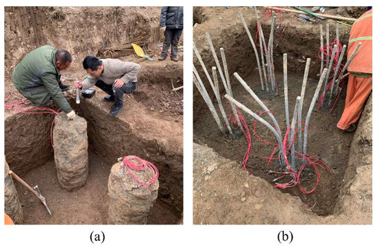 The test piles were constructed using a small rotary drilling rig and cast through the method of auger drilling and grouting. After casting, the quality of the micropile installation was inspected, and a cap was cast from the top of the pile to a depth of 0.6 m. The on-site construction process is illustrated in Figure 5. To ensure the monitoring of axial forces at different depths of the micropiles (1 m below the pile top, mid-section, and 1 m above the pile bottom), three strain gauges were installed beneath the pile cap of each pile. This setup allowed for the monitoring of axial forces at the top, middle, and bottom sections of the micropiles, ensuring the monitoring of axial force distribution and variations in different soil layers. The specific locations of the strain gauge installations are shown in Figure 6.