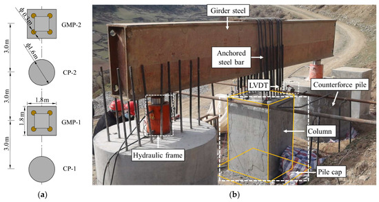 The test was conducted using reaction piles with a diameter of 1.6 m and a length of 8 m to provide support reaction, and the micropiles were constructed using the method of manual auger drilling and grouting. The experimental loading setup consisted of two 1000 kN capacity jacks placed on the reaction piles, and four LVDTs (linear variable differential transformers) with a measuring range of 50 mm were positioned on the pile cap surface. Vertical displacements at the pile cap were measured at each load increment, with the LVDTs placed at the edges of the upper column plane. The reaction piles were positioned on both sides of the test pile and transmitted force through steel beams, which were further transferred to the test pile cap via tension rods. Two separate tests were conducted on-site: an uplift resistance test (GMP–1) and a horizontal resistance test (GMP–2). The experimental loading setup and on-site layout are illustrated in Figure 7.