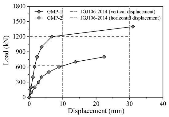 The experiment was conducted in accordance with the “Technical Code for Testing of Building Foundation Piles” (JGJ106–2014: China Architecture and Buliding Press, Beijing, China) using the slow sustained load method to apply loads on the group pile foundation. The estimated ultimate uplift bearing capacity of the group pile foundation was 2000 kN, and the estimated ultimate horizontal bearing capacity was 1000 kN. The load increments were set as 1/10 of the estimated ultimate loads, resulting in loading increments of 200 kN for uplift tests and 100 kN for horizontal static load tests. For the uplift loading, the first load increment was set at 2 times the standard load increment. During the experiment, the loading was stopped when the foundation reached failure. The failure criteria were defined as the point where the load dropped sharply or when the uplift displacement reached 30 mm. For the horizontal direction, the horizontal bearing capacity of the pile was determined at a displacement of 10 mm (or 6 mm for buildings sensitive to horizontal displacement) at the ground level. The test results (Figure 8) showed that for GMP–1, the load–displacement curve exhibited a sudden change at the 6th load increment. This observation suggests the occurrence of relative sliding between the pile and the soil at this point, with a critical uplift capacity limited to only 1200 kN. As for GMP–2, the load–horizontal displacement curve was relatively gentle, and the horizontal ultimate bearing capacity of the micropile group foundation was determined to be 620 kN, corresponding to a horizontal displacement of 10 mm. The on-site test results were compared with the results obtained using the simplified calculation method recommended in the “Technical Code for Building Pile Foundations” (JGJ94-2008: China Industy Building Press, Beijing, China). The comparative results are presented in Table 2. It is evident from Table 2 that the two methods yield similar bearing capacity values. However, the results obtained using the traditional calculation method are slightly lower than the on-site test results. This difference may be attributed to the increased group pile efficiency factor in the micropile group [35].